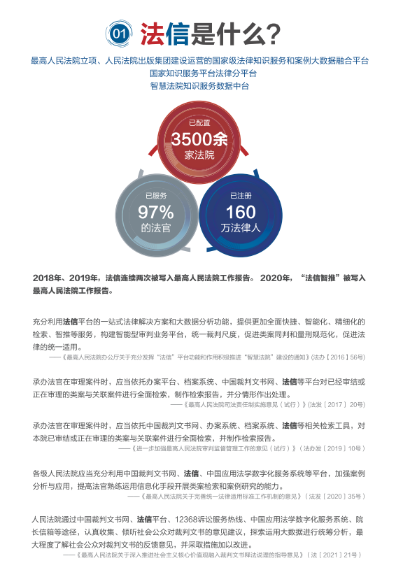 法信平臺(tái)的合作建設(shè)伙伴——中國(guó)司法大數(shù)據(jù)研究院有限公司是2016年11月10日由最高人民法院和中國(guó)電子科技集團(tuán)有限公司等單位共同籌建成立,是最高人民法院信息化頂層設(shè)計(jì)與集成總體單位,旨在打造智慧司法引領(lǐng)型平臺(tái)企業(yè),提供國(guó)內(nèi)一流的司法信息服務(wù)。公司在智慧法院總體設(shè)計(jì)、人工智能應(yīng)用、涉訴信息服務(wù)、信息系統(tǒng)集成評(píng)估等諸多方面開(kāi)展了一系列卓有成效的工作,同時(shí)通過(guò)一系列司法大數(shù)據(jù)專(zhuān)題研究工作,為國(guó)家治理體系和治理能力的現(xiàn)代化貢獻(xiàn)力量。