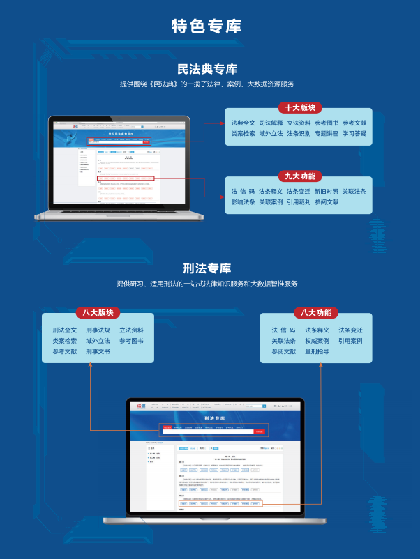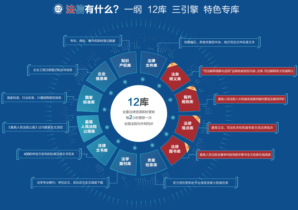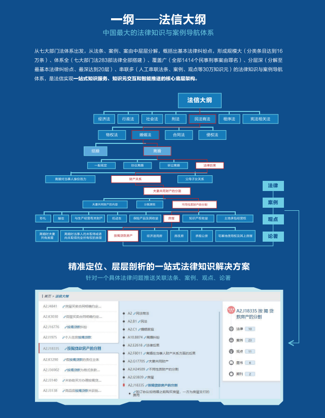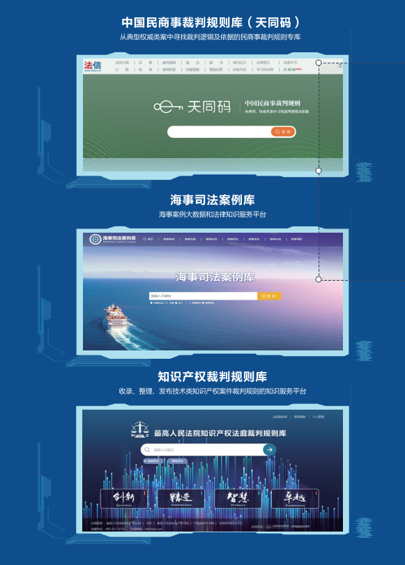 為響應(yīng)習(xí)近平總書(shū)記關(guān)于全面加強(qiáng)知識(shí)產(chǎn)權(quán)保護(hù)工作的要求,承建最高人民法院首個(gè)專(zhuān)門(mén)針對(duì)知識(shí)產(chǎn)權(quán)審判領(lǐng)域的法律知識(shí)大數(shù)據(jù)平臺(tái)——“法信知識(shí)產(chǎn)權(quán)版”“知識(shí)產(chǎn)權(quán)法庭裁判規(guī)則庫(kù)(知己平臺(tái))”等,同時(shí)建設(shè)運(yùn)營(yíng)《最高人民法院公報(bào)》數(shù)據(jù)庫(kù)、國(guó)內(nèi)首家少數(shù)民族語(yǔ)言文字法律專(zhuān)業(yè)數(shù)據(jù)庫(kù)——“中國(guó)審判法律應(yīng)用支持系統(tǒng)蒙文版”等。在公共法律服務(wù)方面先后建設(shè)并推出“東法智慧訴服系統(tǒng)”“東法基層法治管理服務(wù)系統(tǒng)”,通過(guò)知識(shí)服務(wù)為法治社會(huì)提供助力。