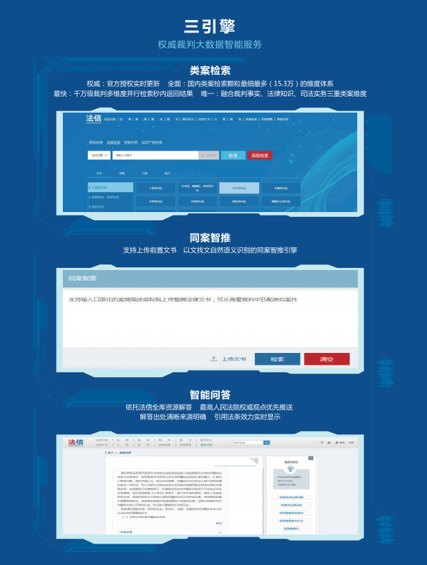 在智能化法律知識(shí)服務(wù)方面,先后牽頭或深度參加全國(guó)人大常委會(huì)法工委、最高人民法院、最高人民檢察院、司法部最高人民法院公報(bào)數(shù)據(jù)庫(kù)、最高人民法院法律統(tǒng)一適用平臺(tái)、中國(guó)裁判文書(shū)網(wǎng)、最高人民檢察院檢務(wù)知識(shí)服務(wù)平臺(tái)等十多個(gè)國(guó)家級(jí)法律數(shù)據(jù)平臺(tái)的建設(shè)和運(yùn)營(yíng)。