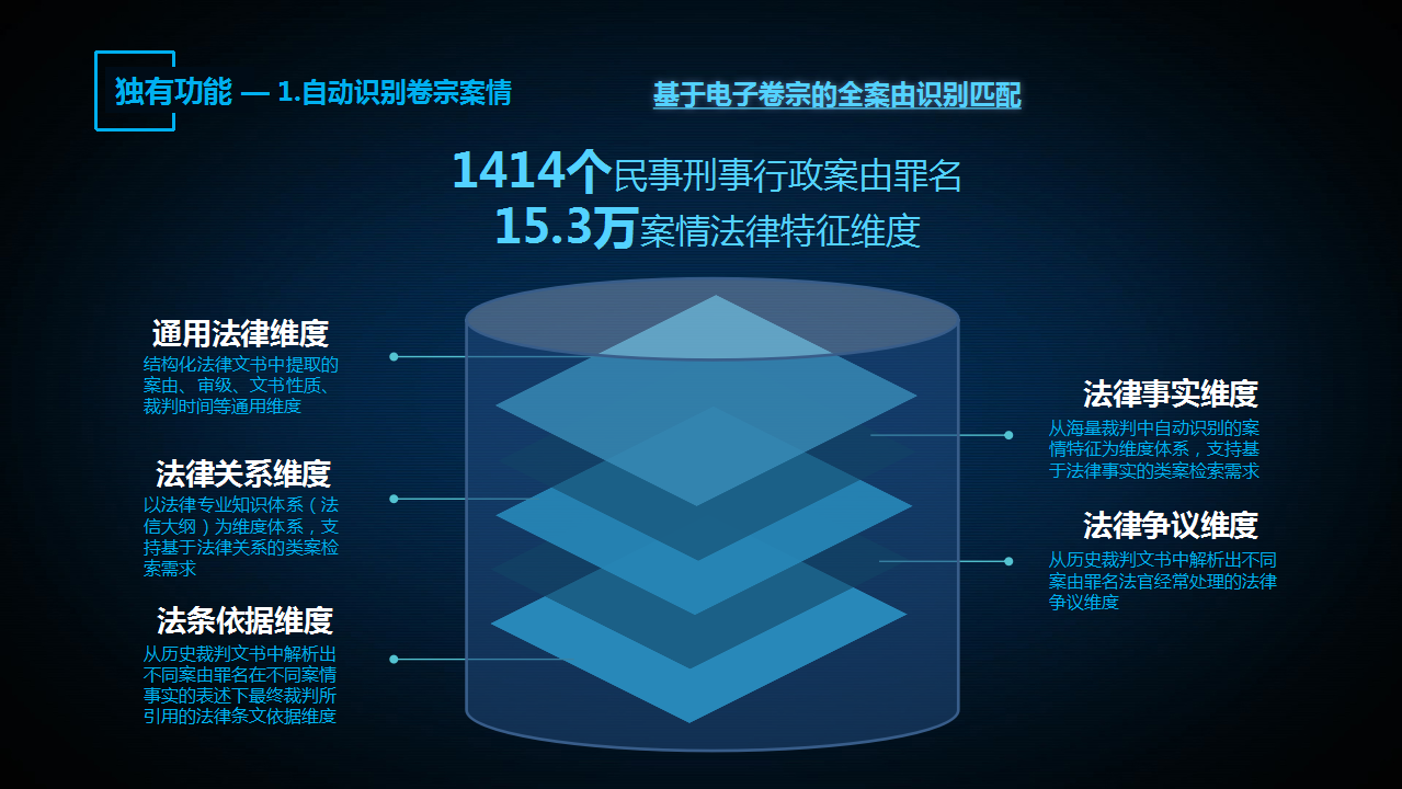 “法信2.0智推系統(tǒng)”的核心功能是實(shí)現(xiàn)基于個(gè)案電子卷宗的全案由識(shí)別匹配。這是系統(tǒng)最核心的技術(shù)能力,實(shí)現(xiàn)了法律關(guān)系、法律事實(shí)、法律爭議、法條依據(jù)和通用法律屬性多達(dá)5層維度的體系化融合,進(jìn)而完成了對(duì)1414個(gè)案由罪名,總量達(dá)15.3萬的法律維度體系的搭建。