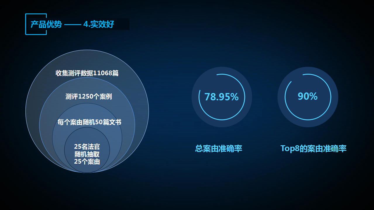 經(jīng)過第三方初步測評(píng)(組織25名法官對(duì)隨機(jī)抽取的25個(gè)案由、1250個(gè)案例、11068篇文書進(jìn)行了測評(píng)),準(zhǔn)確推送的文書為8698,整體準(zhǔn)確率為78.59%,其中民事和刑事常用的top8的案由罪名的準(zhǔn)確率均在90%以上?!胺ㄐ?.0智推系統(tǒng)”在遼寧、蘇州、深圳等地法院部署應(yīng)用,反響良好(參見衍生閱讀)。