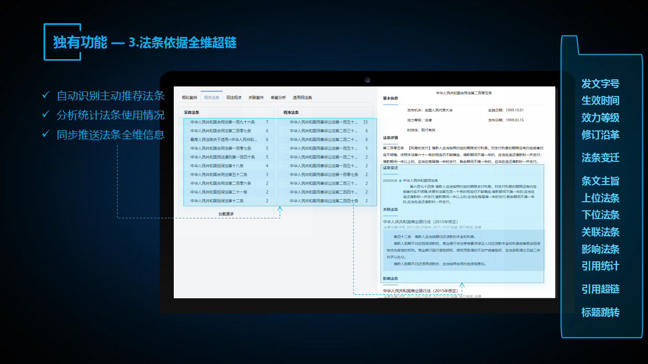 這些大量的法條之間的關(guān)聯(lián)變化、效力影響,一定是通過信息化手段來實(shí)現(xiàn)。法信智推系統(tǒng)的適用民法典功能,就是利用信息化手段幫助法官快速標(biāo)定自己經(jīng)辦案件所依據(jù)的民法典條文,提示新舊法條變遷,幫助法官正確引用民法典條文。