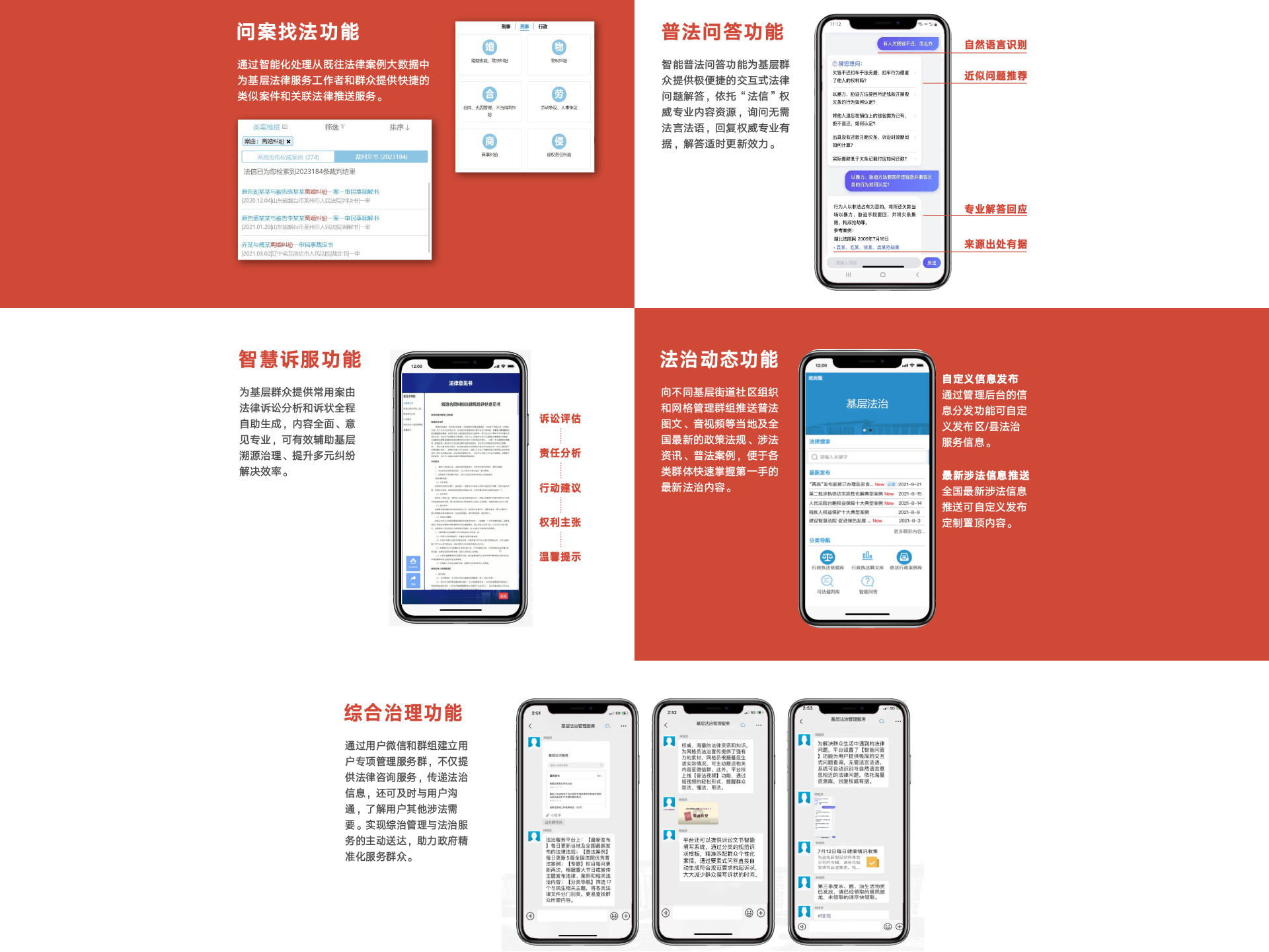 細(xì)分場景進(jìn)行法治服務(wù)和管理,通過精準(zhǔn)觸達(dá)和全員覆蓋為基層社會綜合治理提供強(qiáng)有力抓手。